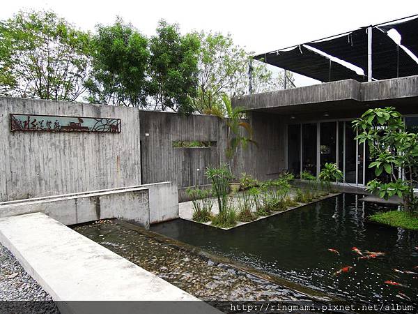 簡約清水模的建築 融入在清澈水池及綠色水草中 更顯獨特風格